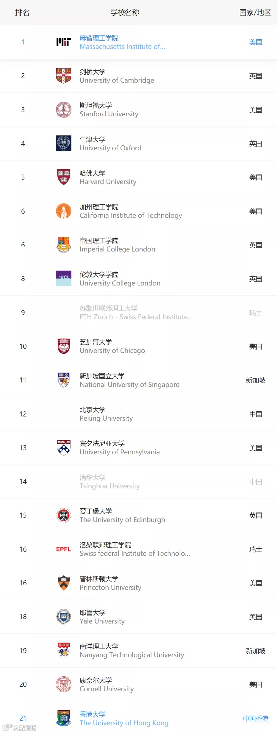 在TOP50高校中,中国内地高校仅有2所入围:清华、北大。