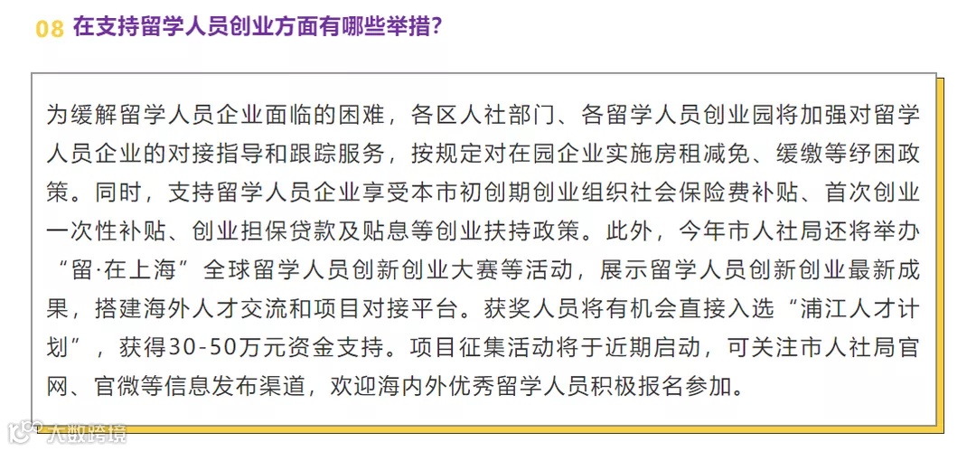 此外,今年市人社局还将举办“留·在上海”全球留学人员创新创业大赛等活动,展示留学人员创新创业最新成果,搭建海外人才交流和项目对接平台。获奖人员将有机会直接入选“浦江人才计划”,获得30-50万元资金支持。