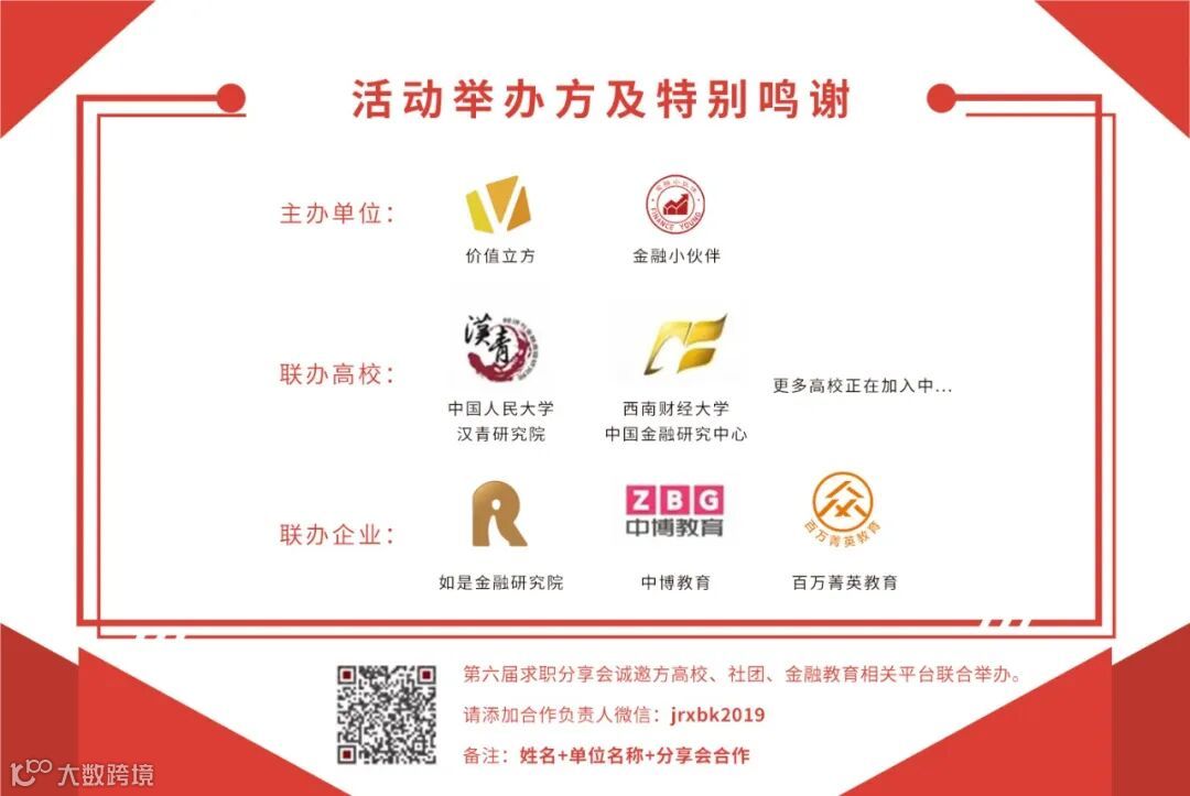 历届活动金融小伙伴跟国内数十所985、211校园都一起合作,本届分享会活动由价值立方、金融小伙伴主办,如是金融研究院、中博教育、百万菁英教育、中国人民大学汉青研究院、西南财经大学中国金融研究中心等知名院校联合举办。