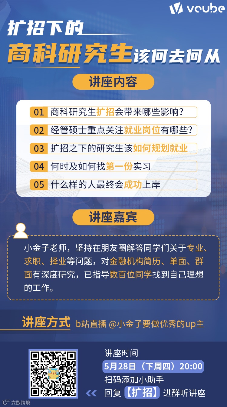 关注下周四晚,“金融行业最会讲段子的,段子手里最懂求职规划的”小金子老师给大家带来的专题直播讲座: