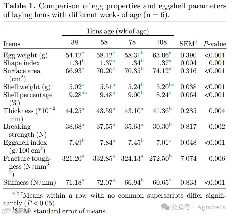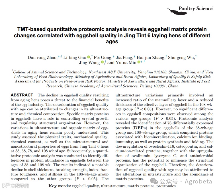 随着年龄的增加蛋壳品质和层次超微结构的变化,采用基于tmt的定量比较蛋白质组学分析方法,揭示高峰鸡和晚产鸡蛋壳中的关键差异蛋白。为更好地了解关键基质蛋白的基本机制,并揭示老年产蛋鸡蛋质量差的原因。采集了38、58、78和108周龄京粉6号蛋鸡的鸡蛋样品,研究并对其蛋壳品质、化学组成、超微结构和蛋白质组进行分析。