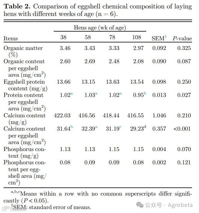 表2所示。不同年龄组蛋壳中有机质、钙、磷和总基质蛋白含量无显著变化( P > 0.05)。108W龄组的蛋壳总蛋白和蛋壳总钙含量与其他年龄组相比大幅下降( P < 0.05)。