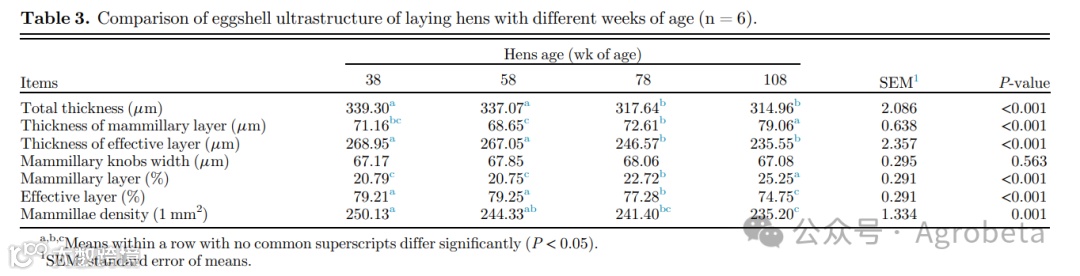 蛋壳超微结构的老化与年龄有关。表3所示。与其他蛋壳组相比,78W龄组和108W龄组的总钙化和有效蛋壳层厚度显著下降( P<0.05)。