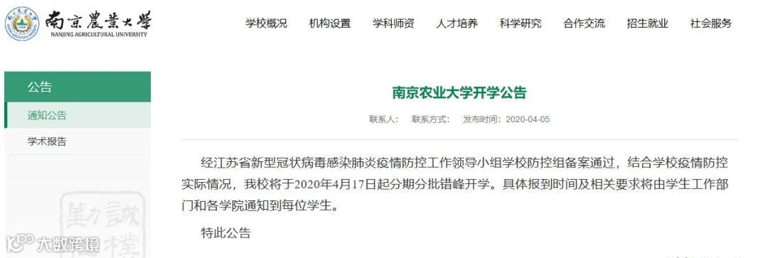 南京农业大学4月5日曾发布开学公告,称学校将于17日起分期分批错峰开学。据悉,因各类学生具体情况差别较大,学校尊重学生意愿,可选择自愿返校或不返校。