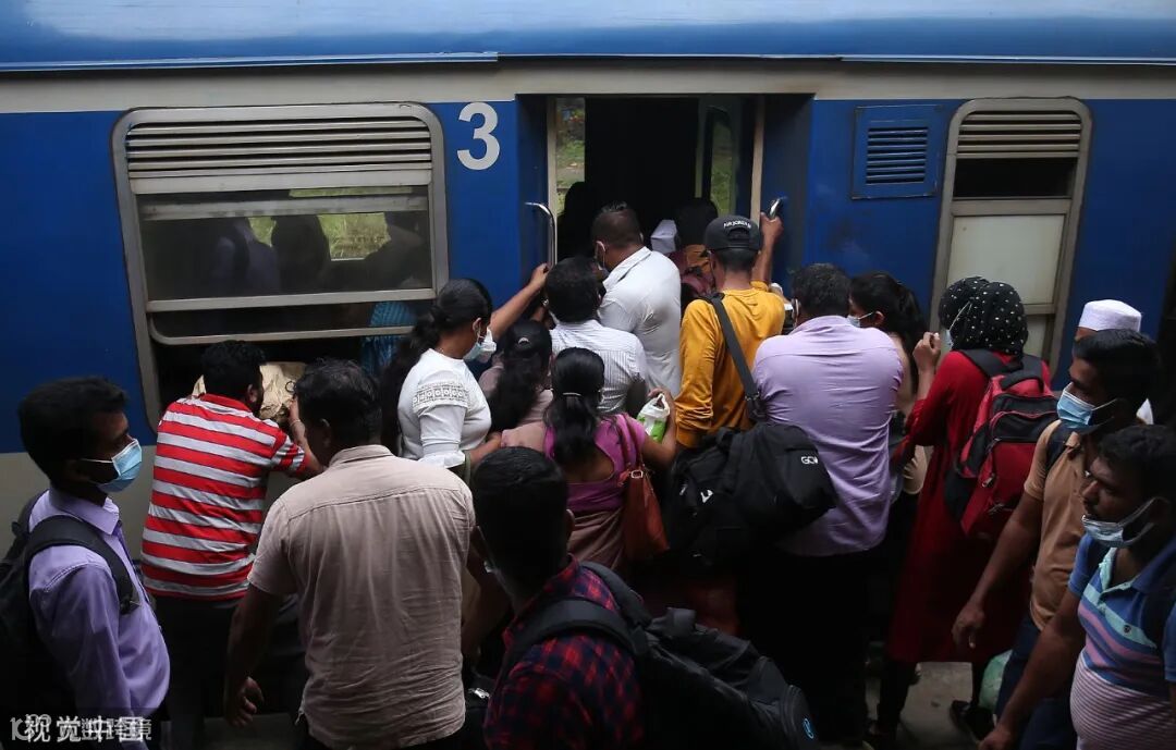 图|当地时间2022年7月6日,斯里兰卡首都科伦坡,乘客试图进入拥挤的火车