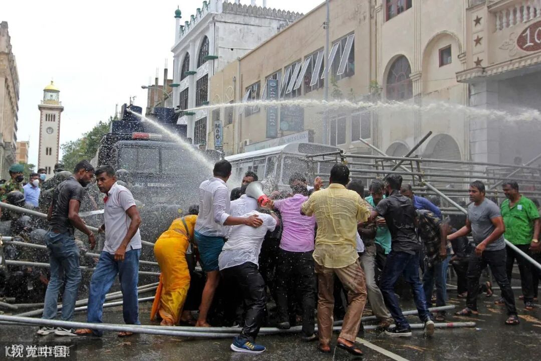 图|当地时间2022年7月6日,斯里兰卡科伦坡,警方动用催泪瓦斯和高压水枪驱散抗议人群