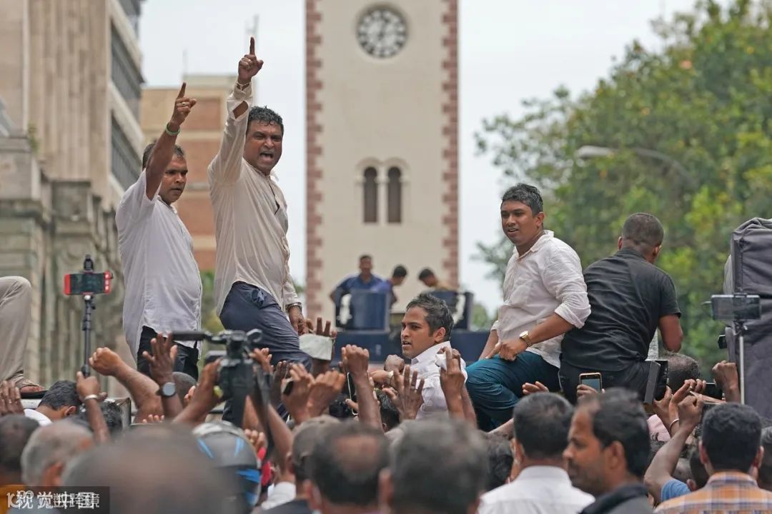 图|当地时间2022年7月6日,斯里兰卡科伦坡,议员纳林·班达拉站在屏障上举行抗议,要求总统戈塔巴雅·拉贾帕克萨辞职
