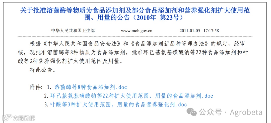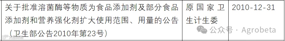 2020年4月9日,国家市场监督管理总局及中国国家标准化管理委员会发布批准了包括GB 38850-2020《消毒剂原料清单及禁限用物质》,规定了消毒剂可以使用的85种原料活性物质、115种原料惰性成分等原料清单,以及禁止使用、限制使用的物质清单,从源头控制消毒剂的有毒有害物质含量。有关溶菌酶的相关规定:人类药用的疫苗、血清或毒素及其制品等用于产生主动或被动免疫的制剂、用于诊断免疫状态的制剂(溶菌酶、溶葡萄球菌酶除外)。