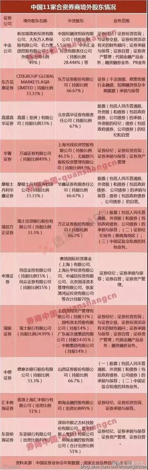 另外,我们再一起看看券商的情况,当前有十几家合资券商具体情况: