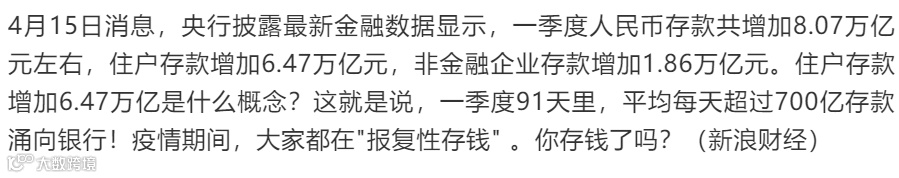 国人可不是少花一点钱,从刚刚过去的第一季度数据显示,平均每天超过700亿存款存入银行。