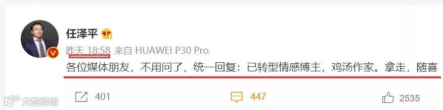 4月15日晚间,任泽平在微博自我调侃式发文:“各位媒体朋友,不用问了,统一回复:已转型情感博主,鸡汤作家。拿走,随喜。”