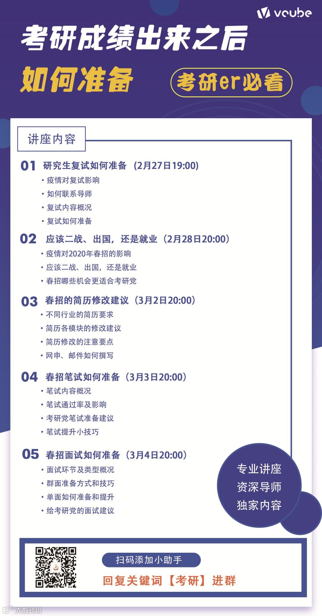 最后,为了帮助大家梳理考研成绩出来后应该如何做?准备了系列免费公开课,考研失利后,如何在二战、出国、就业中做最适合自己的最优选?