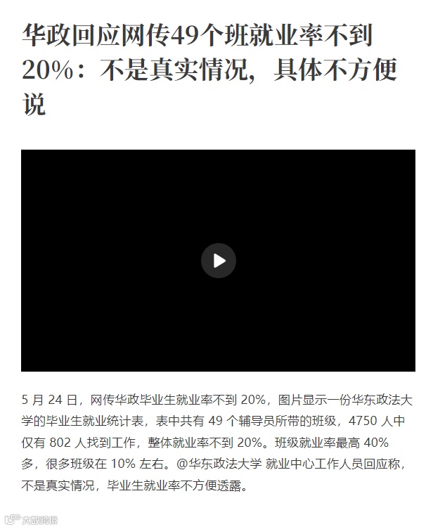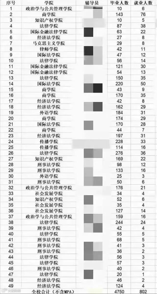 5月24日,网上一张据说是华东政法大学的毕业生就业统计表在各个群刷屏,总人数为4750人,仅有802人找到工作,就业率16.9%,不到20%。班级就业率最高40%多,很多班级在10%左右。