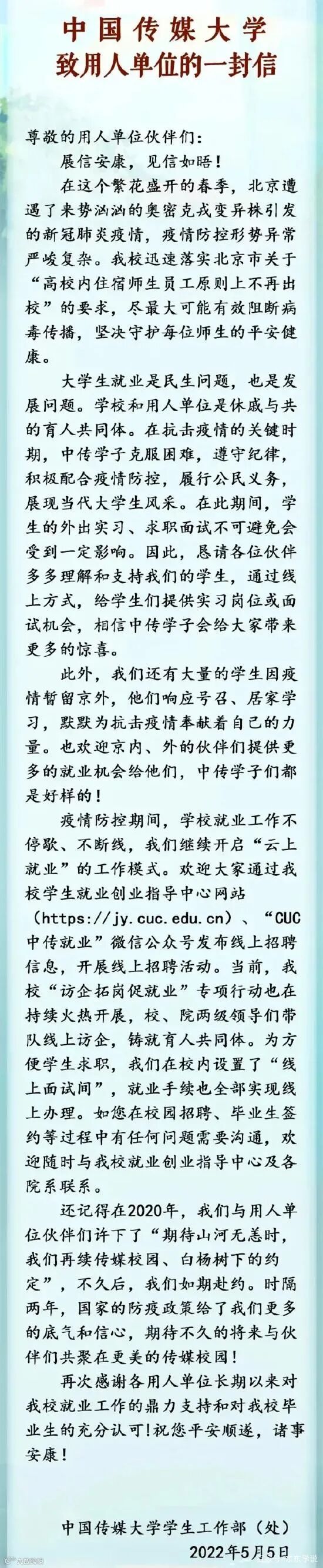 中传给用人单位写信,恳求用人单位多招聘中传的毕业生,中传唉,姿态也这么低了。