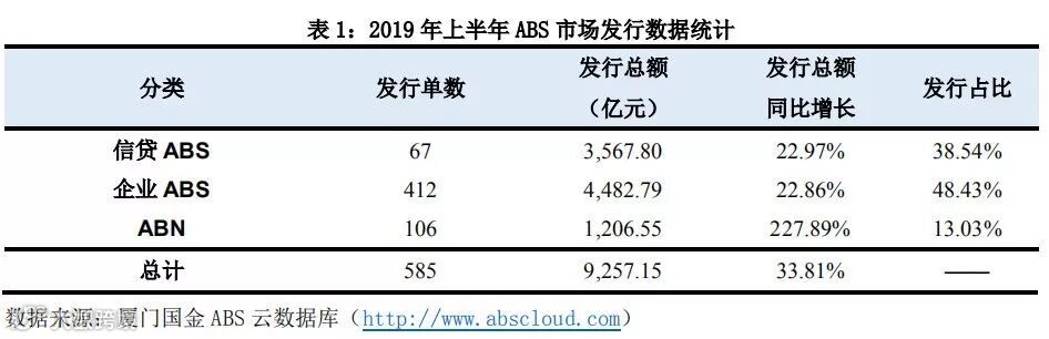 截止到2019年上半年,ABS市场继续保持快速增长态势,共发行产品585单,总计发行规模9,257.15亿元,同比增长33.81%,其中,企业ABS市场占比48.43%。