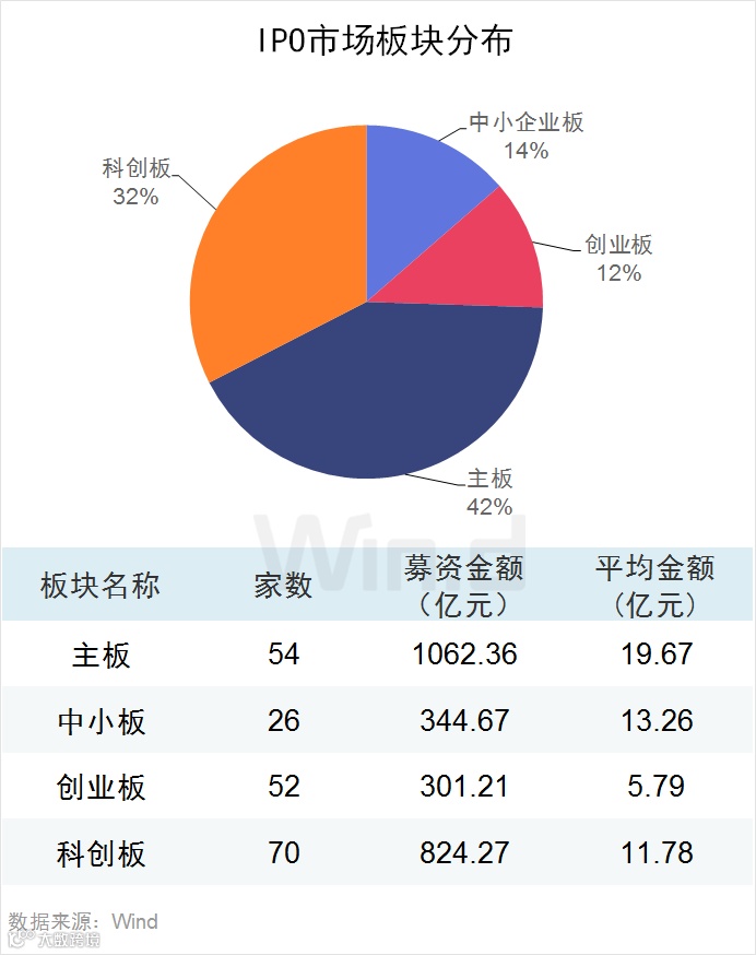 从上市板块来看,2019年IPO融资家数及金额最多的是主板,共上市54家,募资1,062.36亿元,平均募资金额19.67亿元。
