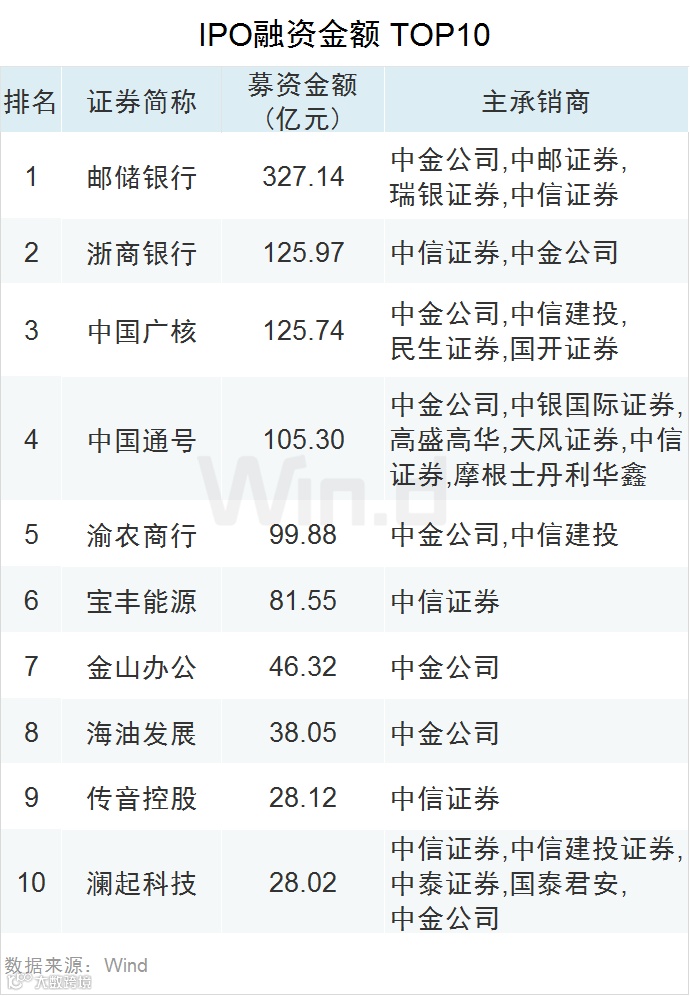 IPO融资金额最大的公司是邮储银行,金额为327.14亿元。前十大IPO共筹资人民币1,006.08亿元,占IPO融资总金额的40%。