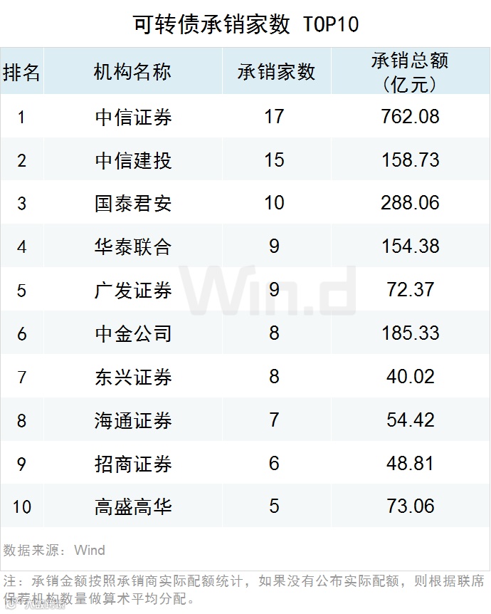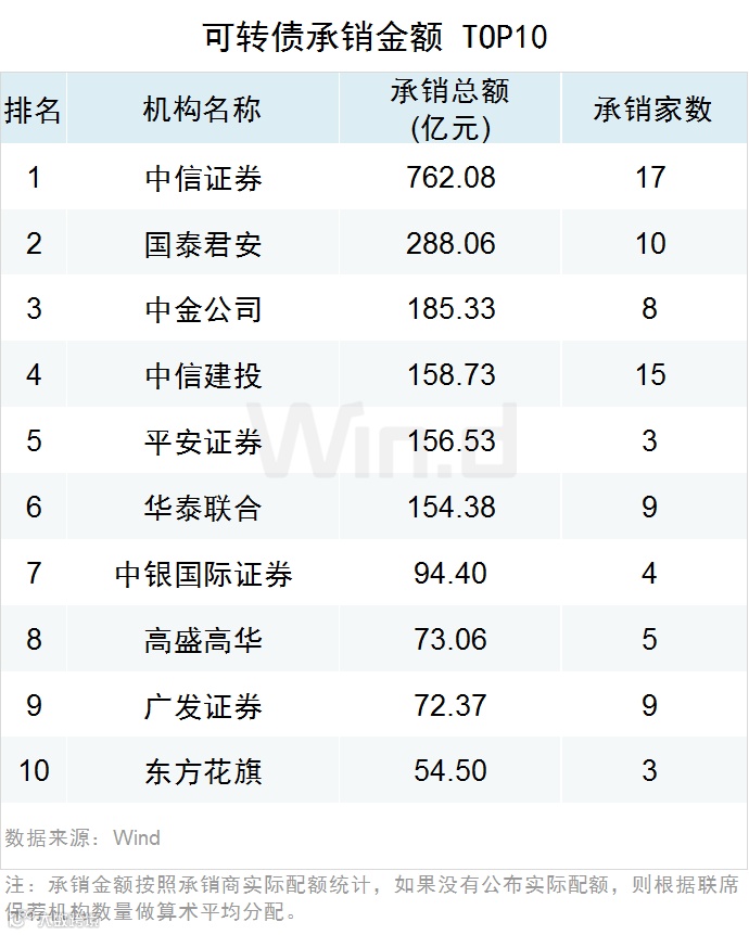 中信证券以762.08亿元的可转债承销金额排名第一。国泰君安及中金公司以288.06亿和185.33亿位居第二和第三。