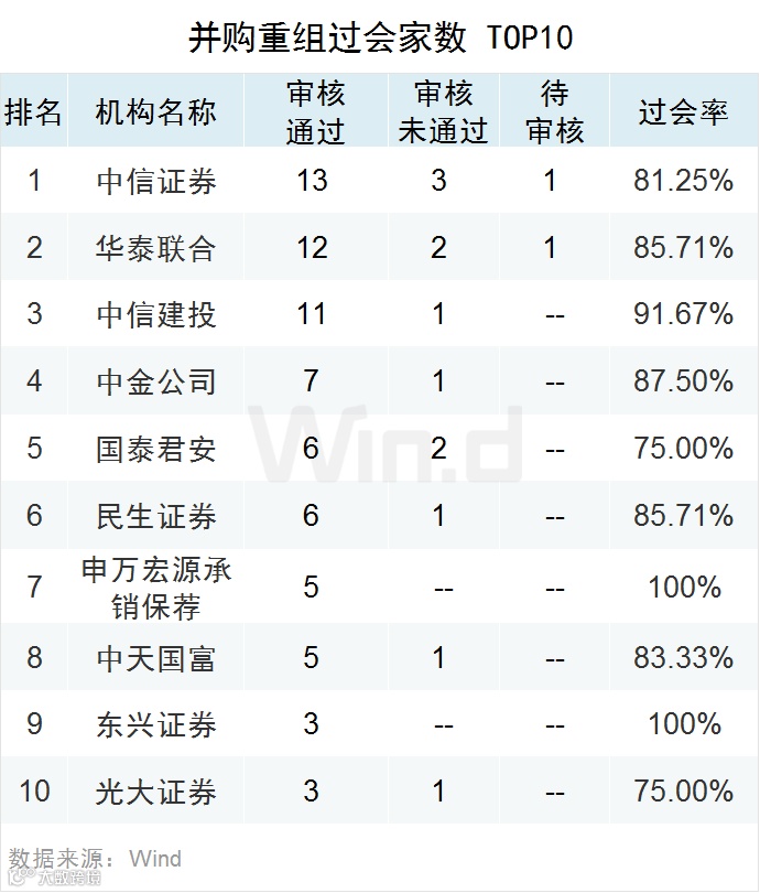 11券商并购重组过会率排名Top10