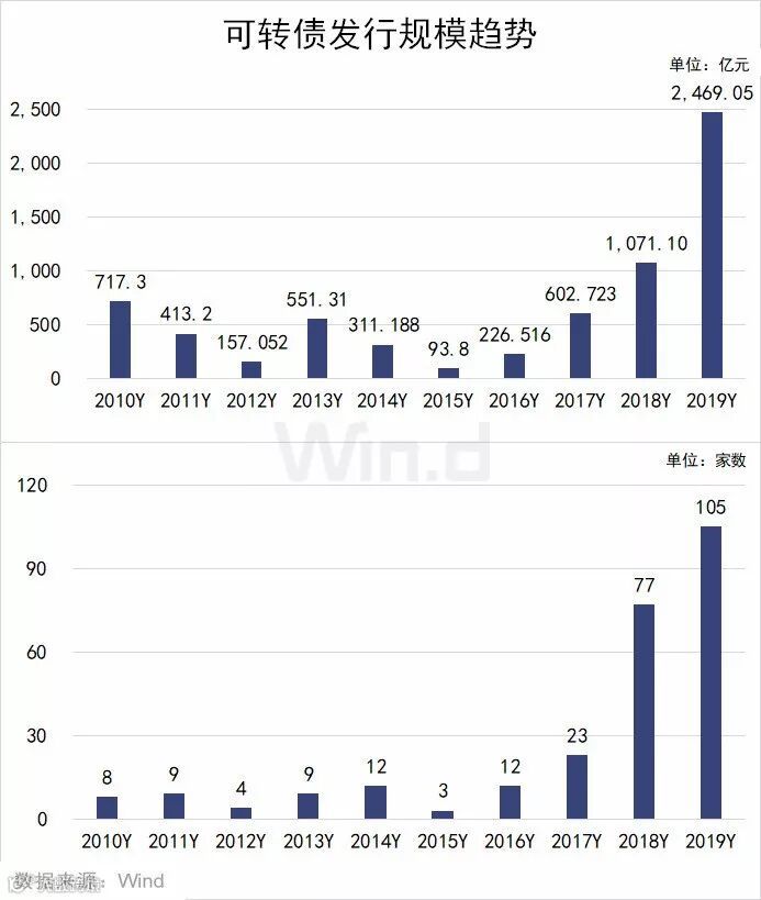 可转债融资在2019年大幅度提高,较2018年的1,071.10亿元的融资规模,同比上升了130.51%。