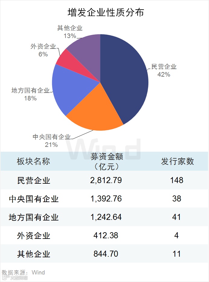 实施增发的企业集中于民营企业,融资金额达2,812.79亿元,占增发融资总额的42%。