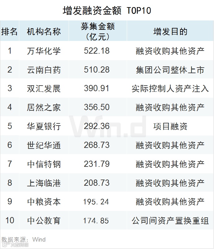 融资金额最大的增发项目是万华化学,融资金额高达522.18亿元。前十大增发项目共融资人民币1,992.71亿元,占增发总金额的46.87%。