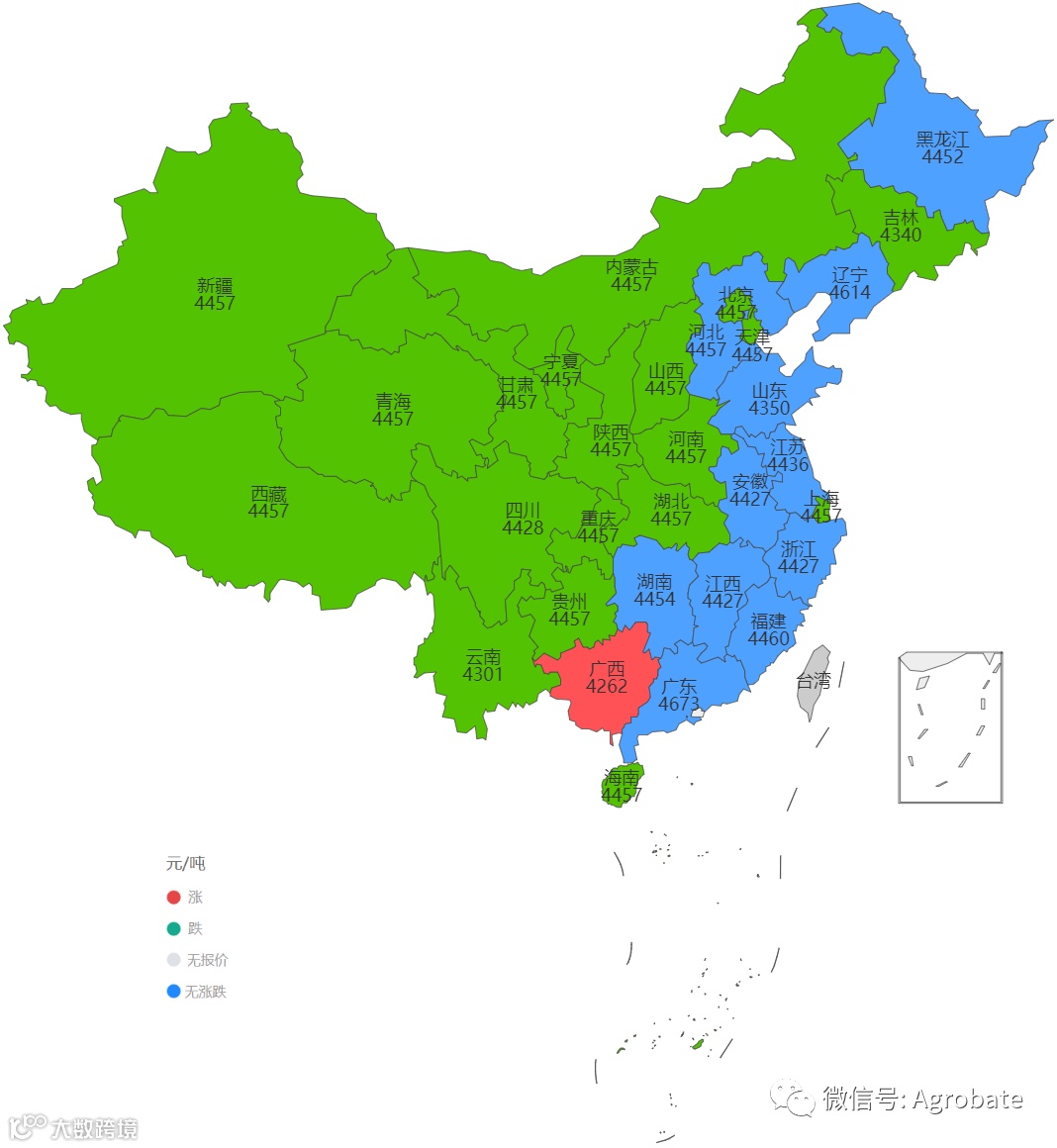导读:按行政省采集不同样本点价格信息,计算玉米、豆粕大宗原料当日采购均价。 信息来自中国饲料行业信息网、Mysteel、百度爱采购等。供参考。