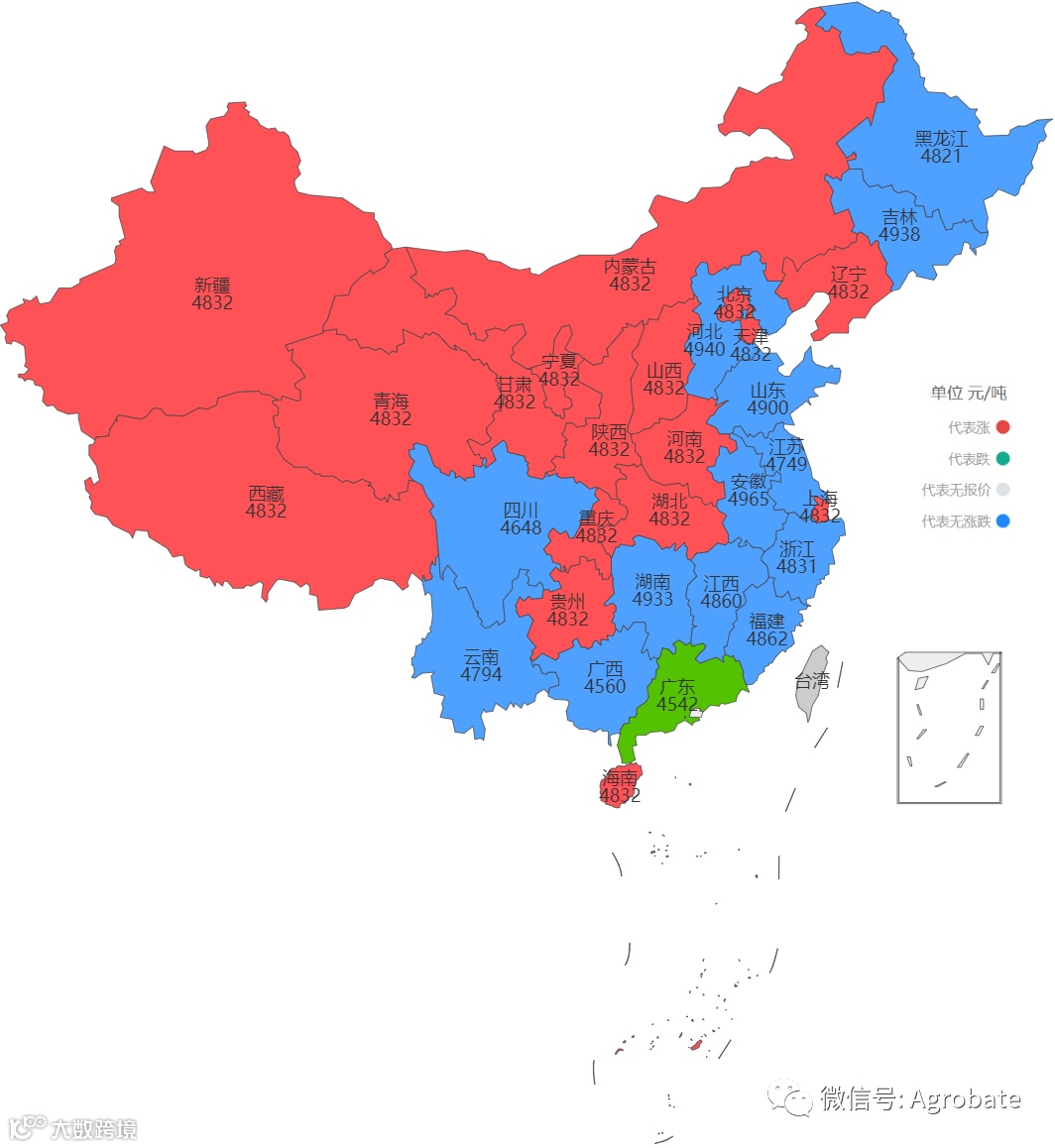 导读:按行政省采集不同样本点价格信息,计算玉米、豆粕大宗原料当日采购均价。 信息来自中国饲料行业信息网、Mysteel、百度爱采购等。供参考。