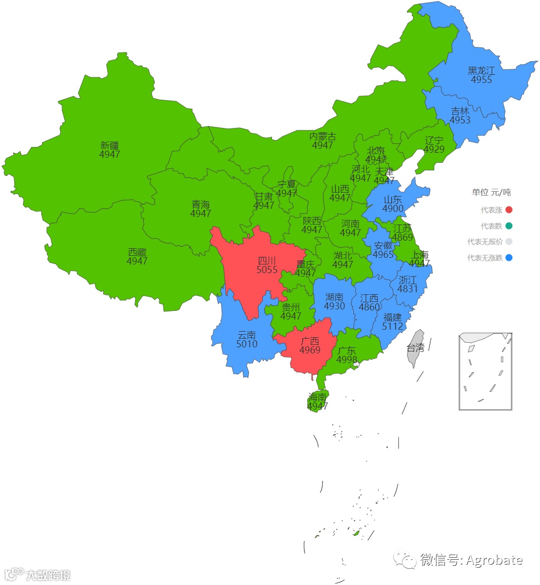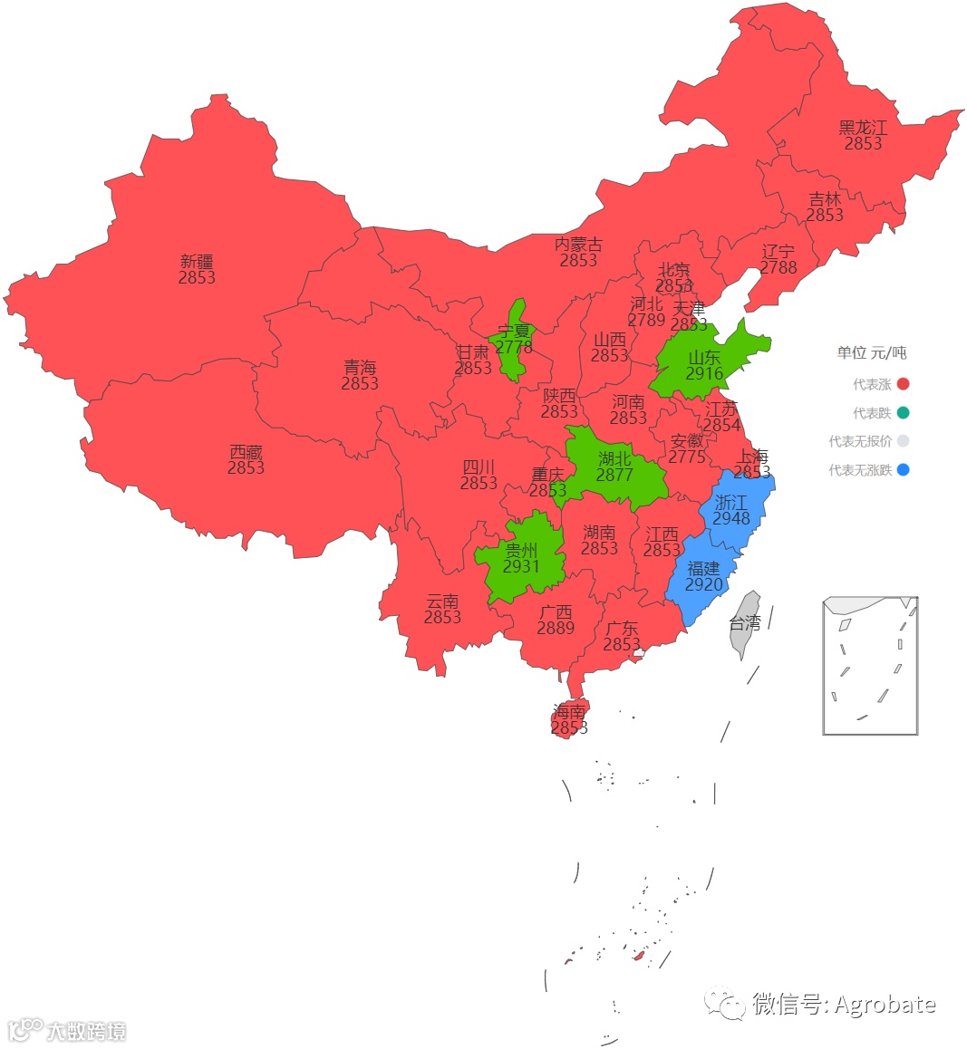 导读:按行政省采集不同样本点价格信息,计算玉米、豆粕大宗原料当日采购均价。供参考。