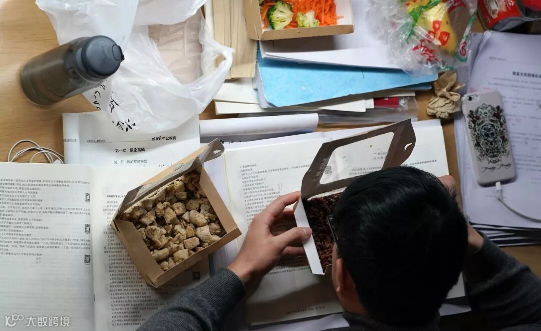 2017年12月7日,郑州大学,学生在考研复习,边吃外卖边学习。考研如同高考,期间很多人都执行“学霸”作息,无社交不打扮