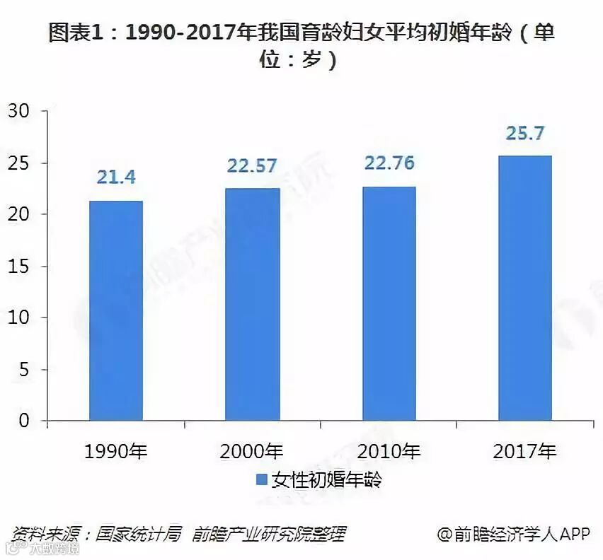 国家统计局全国人口普查报告的数据已经显示,从1990年至2017年,我国育龄妇女的平均初婚年龄从21.4岁推迟到了25.7岁,而且有继续走高的趋势;