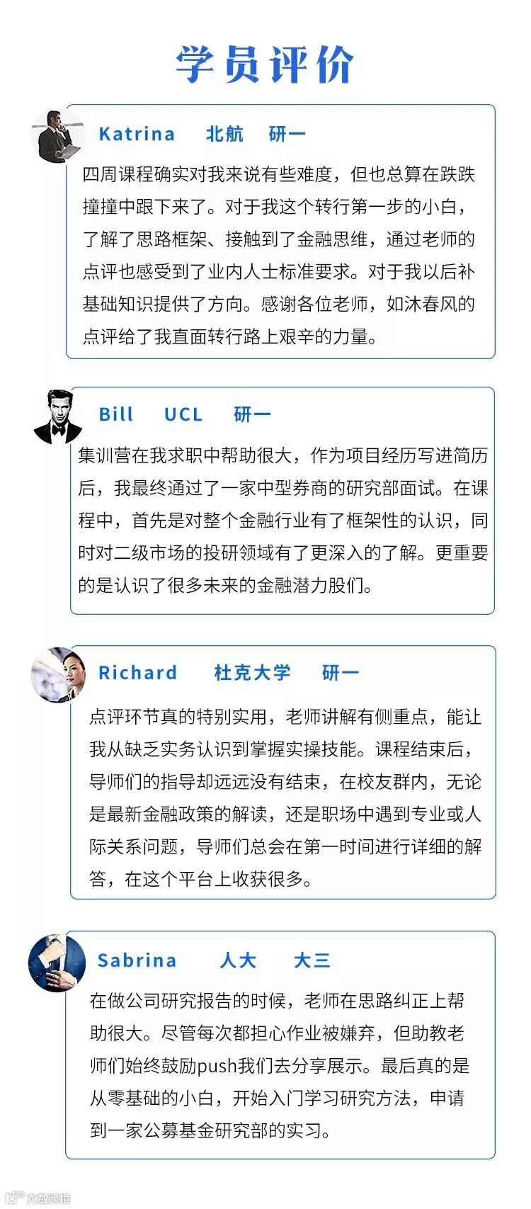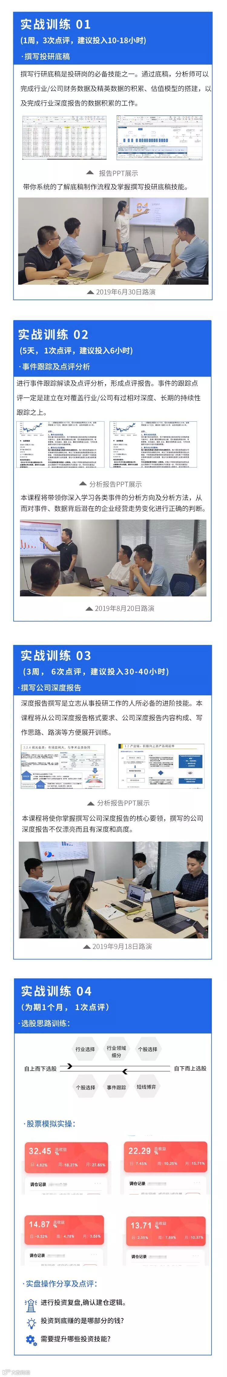 系统性提升学员的二级市场所要求具备的专业基础知识、投资预测、行研底稿及行业深度报告的撰写、项目路演等实操能力,培养券商研究所、公募基金、二级私募、PE/VC/FA 行研岗位等方向人才。