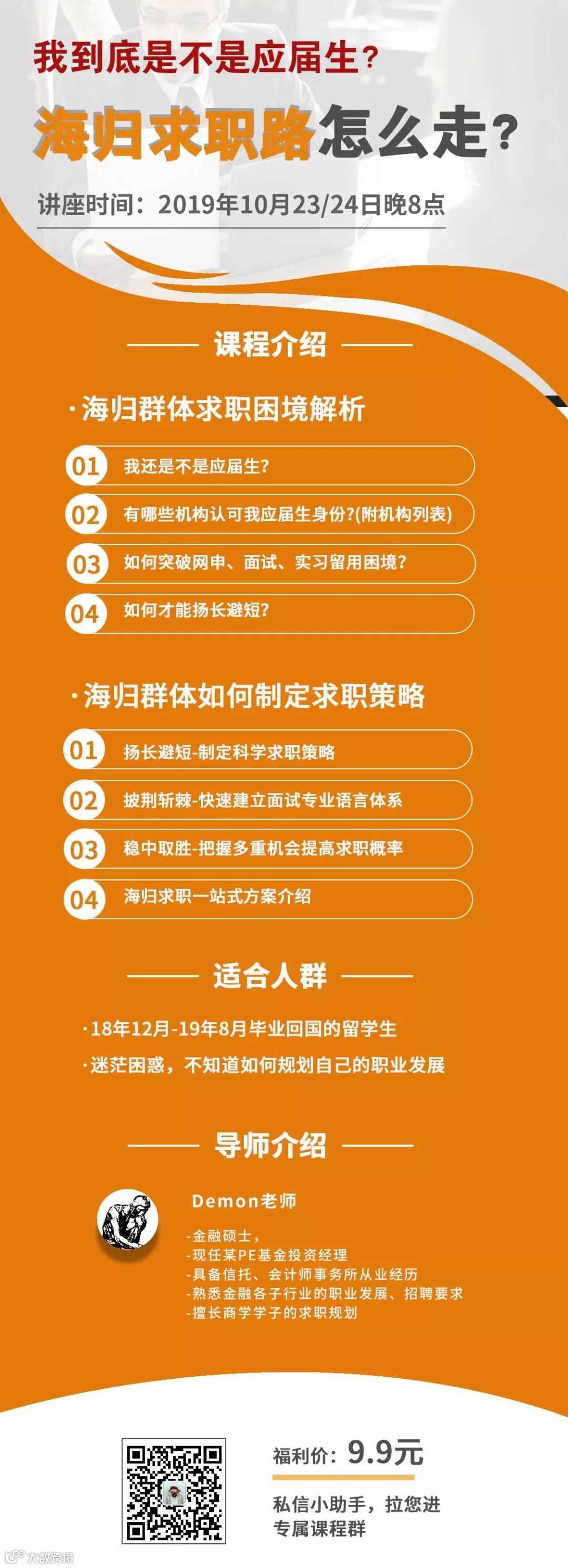 进课程群可领取国内目前金融行业认可海归应届生身份的机构名单,帮您定制私人求职计划,让海归身份变成你求职“利器”,突破网申、面试、实习留用的困境,更加自如地应对国内入职考核流程,全面提升求职技巧。