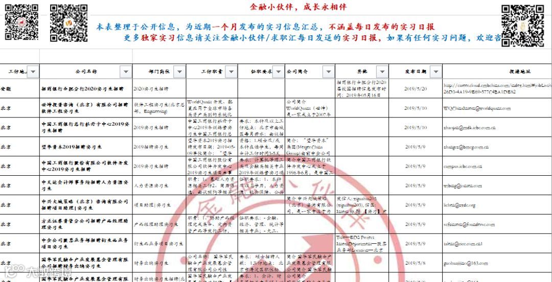 为了陪伴大家顺利找到实习,同时节省大家宝贵的时间和精力,金融小伙伴全网搜索、精心筛选,会在群里实时更新独家招聘信息汇总表。金融小伙伴从成立到现在已经陪伴越来越多的大学生获得实习offer。