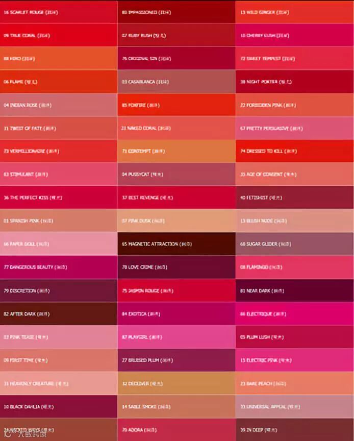 市场中口红的品牌有很多,档次、价位也各不相同,但是这些口红品牌都有一个共同特征:拥有多得超乎想象的色号。口红颜色之多,以至于已经无法用正常的颜色词汇进行描述。比如,TF口红的36号色与37号色几乎一模一样,36号的名称是The Perfect Kiss;37号的名称是Best Revenge。