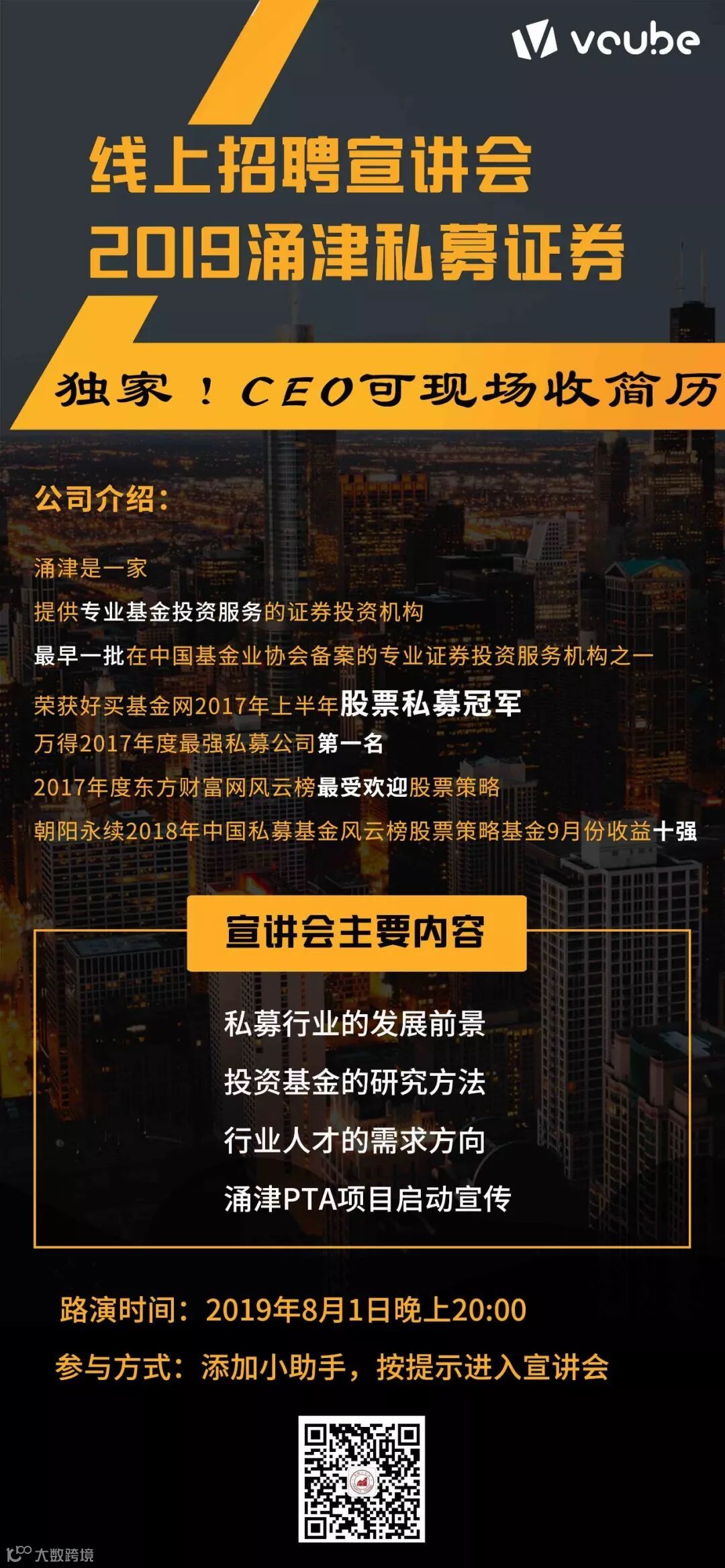 本次宣讲会将在【2019 上海涌津投资 线上招聘宣讲会】举行,添加小助手邀您进群。