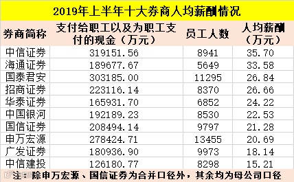 另外,招商证券、华泰证券、中国银河、国信证券、申万宏源等上半年员工的人均薪酬也超过20万元。