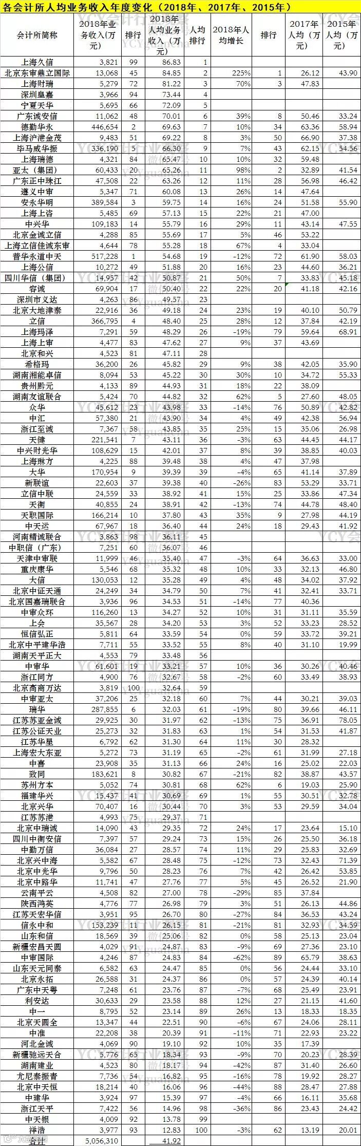 人均业务收入前5名的均为排行靠后的会计所。2018年业务收入过10亿的头部会计所中,德勤华永列是人均最高的,以69.63万列第7,然后为毕马威华振(第9名)、安永华明(第14名)、中兴华(第16名)、普华永道中天(第19名)。普华永道中天还是同比人均业务收入下降12%。