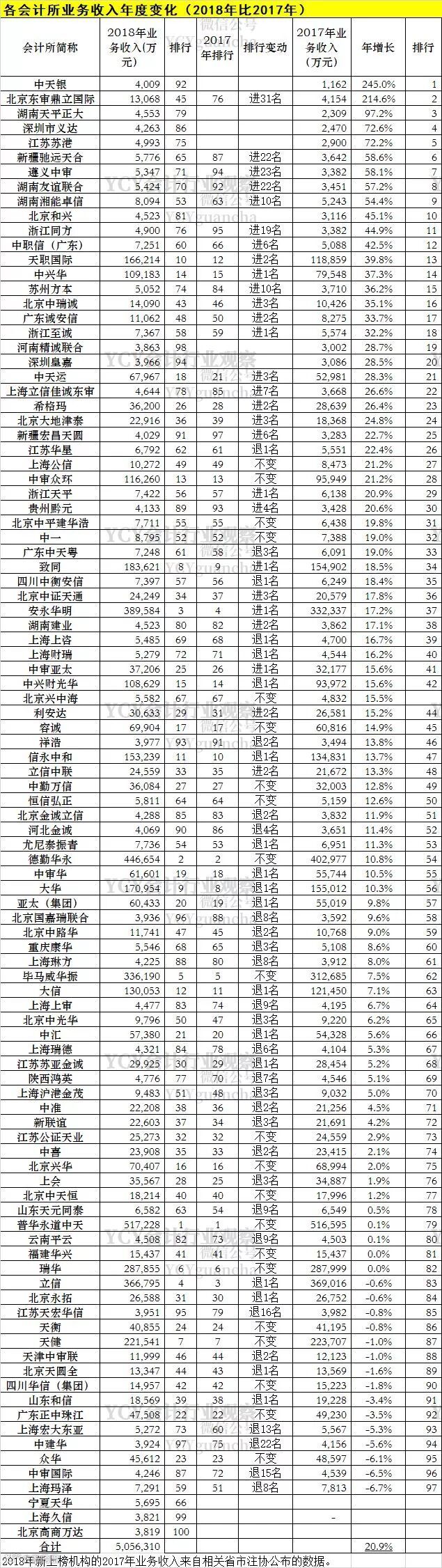 近日,中注协发布了《2018年度业务收入前100家会计师事务所信息》,对比在5月23日发布的公示版本,变化主要在于公示排行62的深圳鹏盛消失、其他会计所名次递补,第100名新增为北京高商万达。