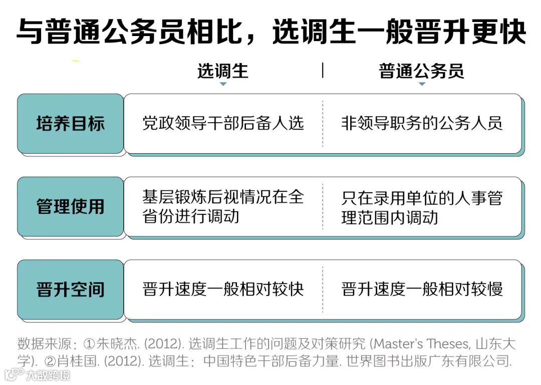 有其他回答提到选调生的内部潜规则是,清北学生一档,其他985归为一档,进去后无论是定级还是之后的晋升机会,清北的学生都有更大的优势。