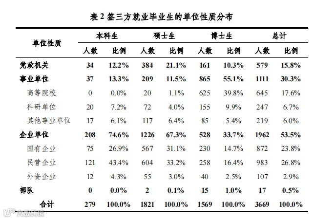 学历越高,进入体制内的毕业生越多。53%本科生,64%硕士生和82%博士生都选择进入体制内。