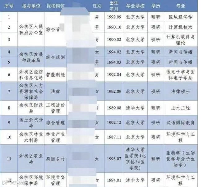 比如:仓前街道办事处录取的是清华材料科学与工程硕士,南苑街道办事处录取的是北大地球物理学博士等等。