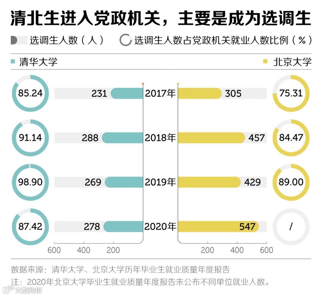 清北公布的2021年选调生人数显示,北大同比增加60%,清华直接增加一倍,双双创历史新高。清北二校选调生一共1300多人,也就是说1300多个“铁饭碗”提前被清北毕业生锁定。