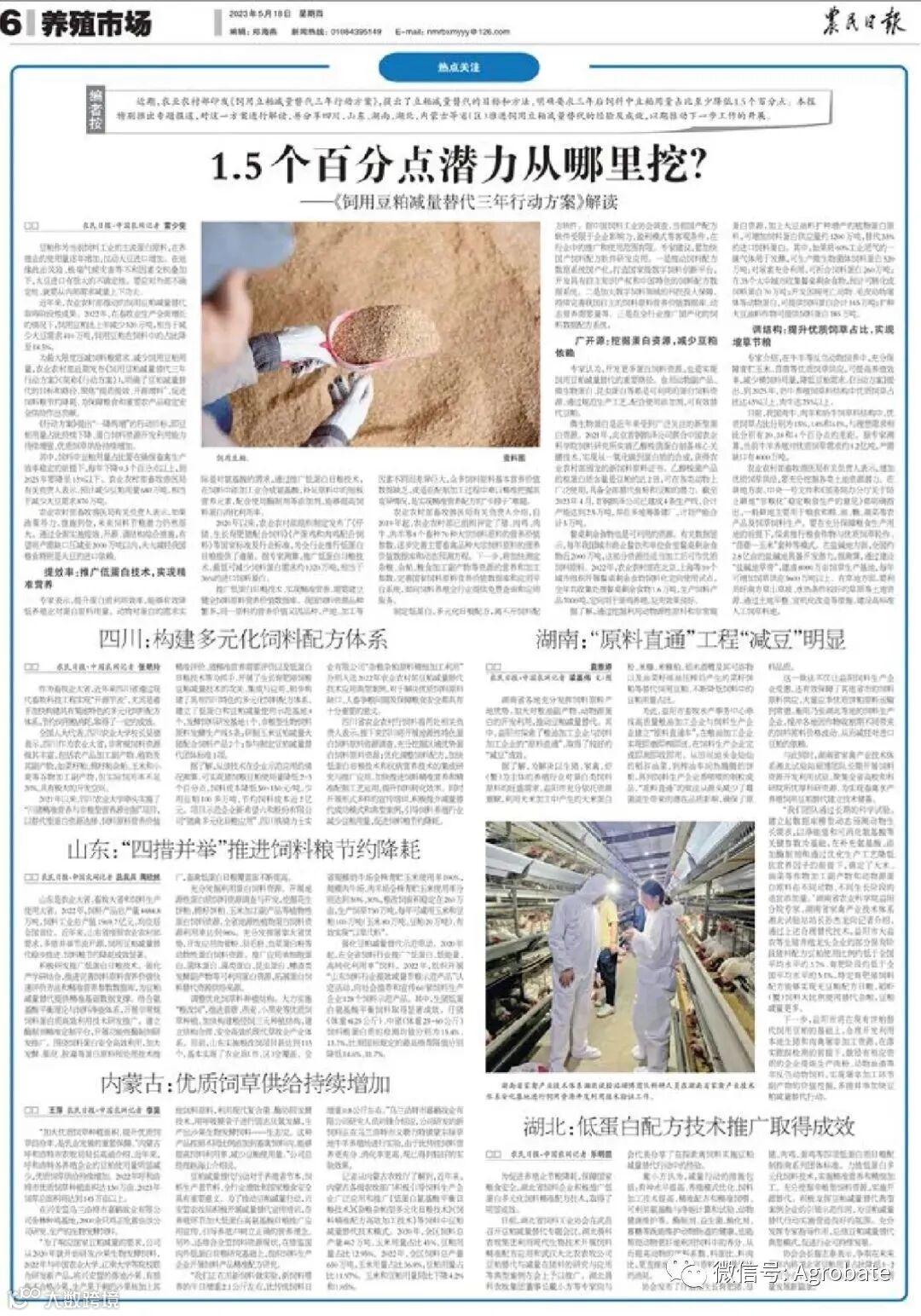 导读:农业农村部《饲用豆粕减量替代三年行动方案》提出了豆粕减量替代的目标和方法,明确要求饲料中豆粕用量占比至少降低1.5个百分点(到2025年飼料中豆粕用量占比从2022年的14.5%降至13%以下),《农民日报》追踪了这一行动进展,并分享四川、山东、湖南、湖北、内蒙古等省(区)推进饲用豆粕减量替代的经验及成效。