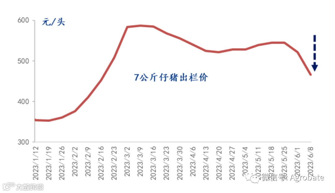 但近期,全国7公斤外三元仔猪价格已经由5月末的544元/头快速下滑至6月上旬的467元/头,降幅达14.2%。