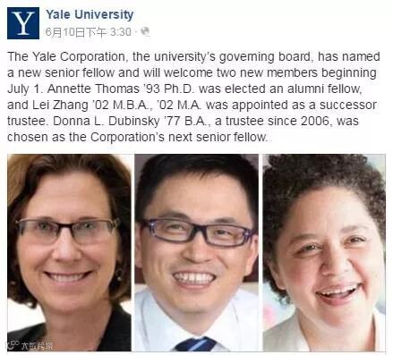 据耶鲁大学官方消息,2016年6月9日,耶鲁大学校长Peter Salovey宣布,张磊将接替前美国麻省最高法院首席大法官玛格丽特•H•马歇尔女士,成为耶鲁大学新任校董。“张磊先生身上集中体现了耶鲁一直寻求的全球领导力”,Salovey校长说,“他的远见卓识对推动耶鲁的国际化和国际交流与合作至关重要,张磊先生此次成为新任校董,将使他自己和耶鲁大学都在不断追求卓越的道路上更进一步。”