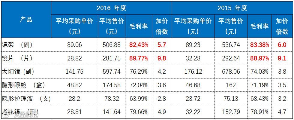 上表的数据显示:镜片的采购成本约为30元/片,而镜架的采购成本约为90元/副,也就是说每副眼镜的平均采购成为约为150元/副。镜片的加价倍数约为10倍,毛利率高达90%(和茅台一个水平了);镜架的加价倍数约为6倍,毛利率也有80%多。
