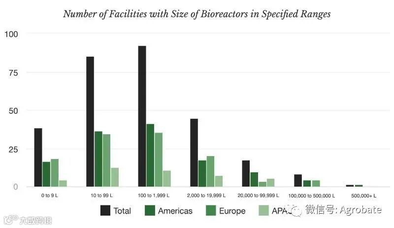 《全球发酵能力状况》列出的150多家设施中,86家生物反应器在10-99L范围内;91家的生物反应器在100-1999L范围内;48家的生物反应器在2000-19000L范围内;20家的生物反应器在20,000-99999L范围内;9家的生物反应器100,000L以上。