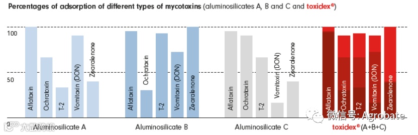 图3 佰霉脱(3种混合硅铝酸盐)对不同毒素的吸附能力