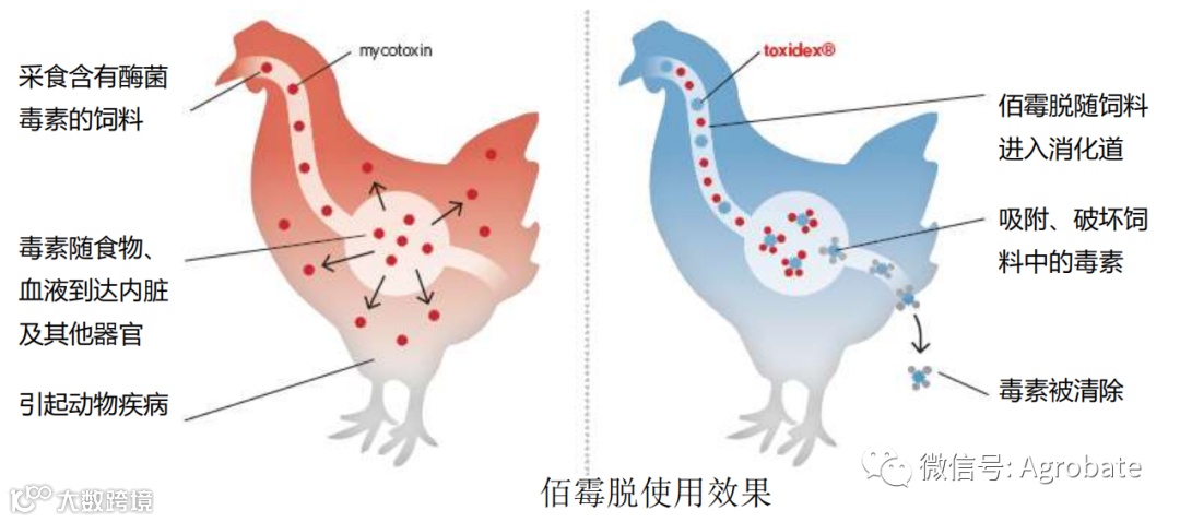 (1)分子破坏机制:复合霉菌毒素降解成分能打开霉菌毒素的内酯环结构,降低或消除毒素毒性。以黄曲霉毒素B1为例,降解为无毒的二羟基-6-甲氧基-呋喃-(2,3-b)苯并呋喃和黄曲霉毒素D1,黄曲霉毒素D1毒性和致突变性分别为黄曲霉毒素B1的1/18和1/450。同时也能有效的降低其他毒素的毒性。如:赭曲霉毒素A、玉米赤霉烯酮、呕吐毒素、T-2毒素等。